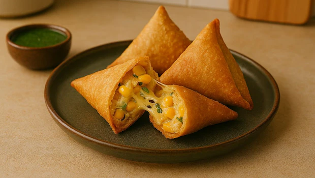 What makes cheese corn samosa stand out is its balance of flavours. Unlike traditional samosas that rely heavily on spices, this version keeps things mild and comforting. The natural sweetness of corn blends with the gooey richness of melted cheese, while light seasoning adds depth without overpowering the filling. It’s this simplicity that has made the snack popular at birthday parties, evening gatherings, and casual get-togethers.