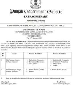 A notification on the reallocation of portfolios was issued late Monday evening by the state government after approval from the Punjab Governor. The move formalises changes that had been speculated for weeks within political circles.